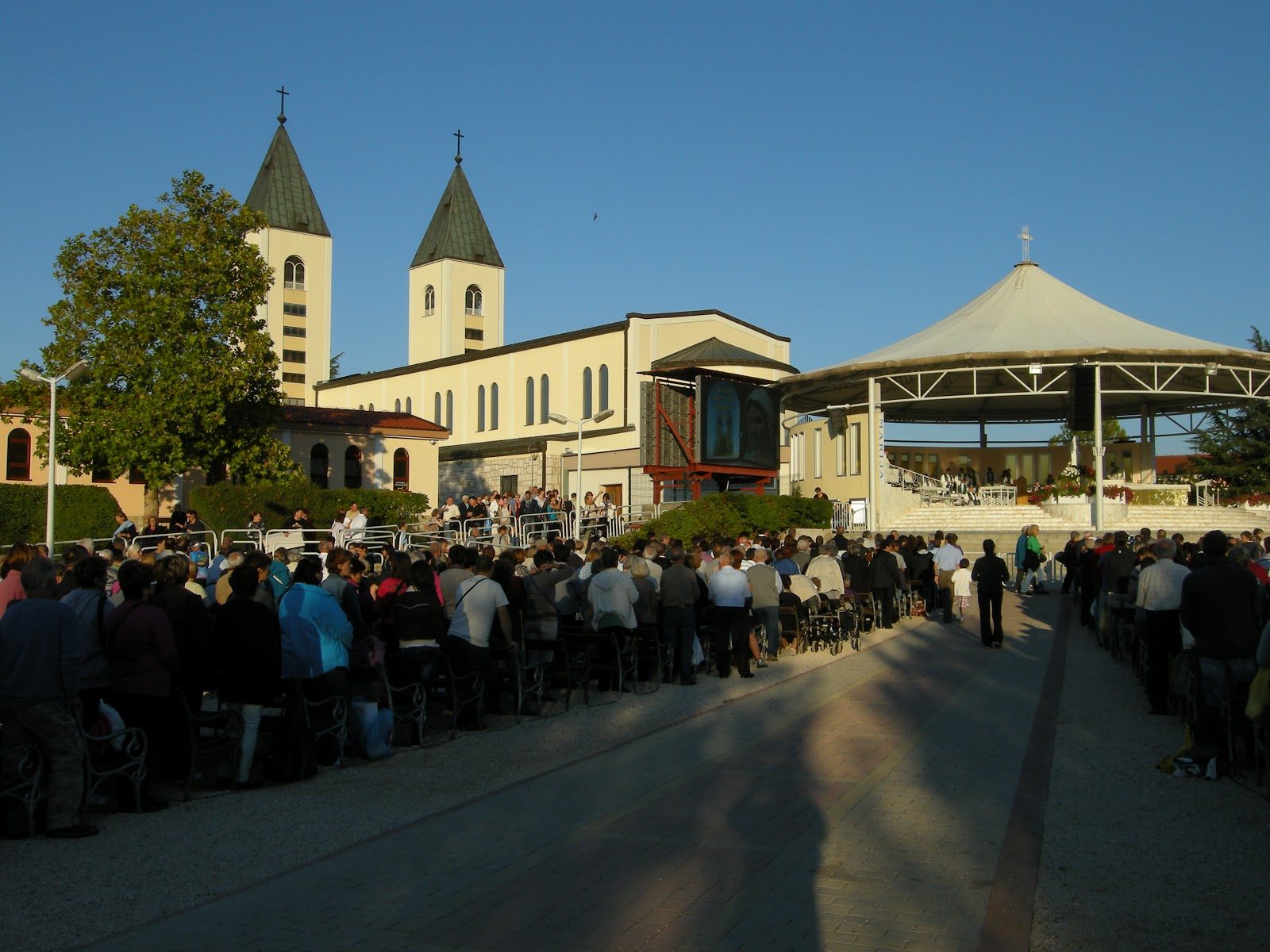 Plac przed kościołem, pomimo ulewnego deszczu pielgrzymi podczas mszy św.